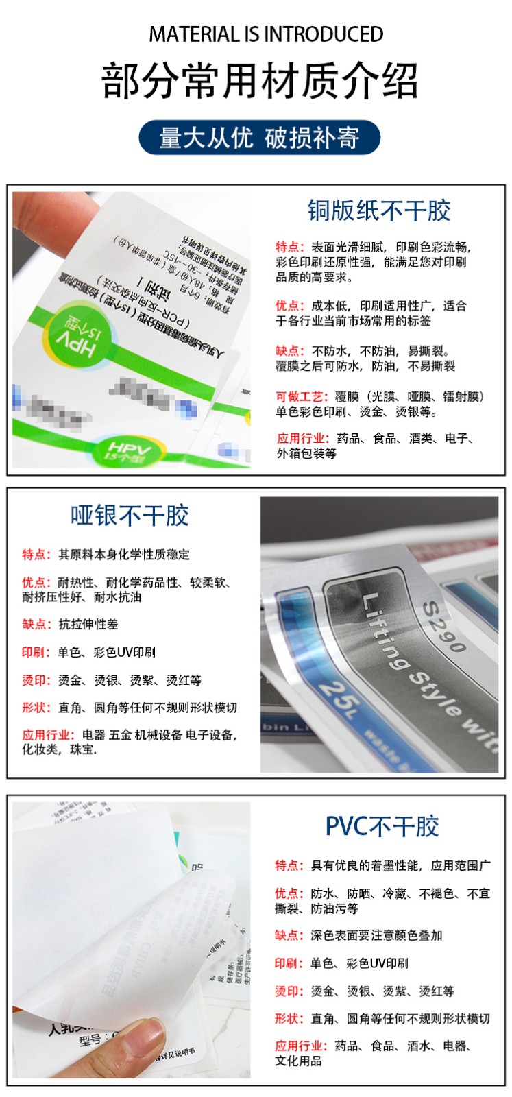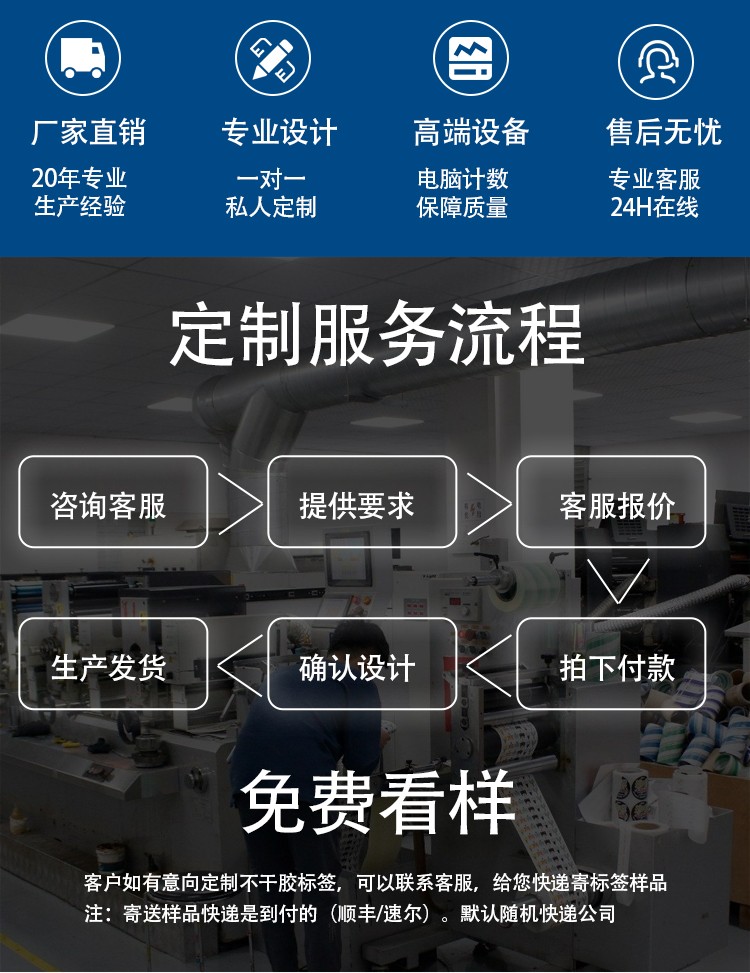 產(chǎn)品名稱::?不干膠印刷,標(biāo)簽印刷,瓶貼印刷,不干膠(標(biāo)簽)印刷 常用尺寸::?按需要定制 常用材質(zhì)::?銅版紙不干膠,書寫紙不干膠,鋁箔紙不干膠,激光鐳射膜不干膠,易碎紙不干膠標(biāo)簽,PVC不干膠標(biāo)簽,PP(聚丙烯)不干膠標(biāo)簽,更多材質(zhì)請(qǐng)咨詢客服 加工工藝::?覆啞膜、覆光膜 出貨周期::?無(wú)需工藝3天,需覆膜4天,更多工藝請(qǐng)咨詢客服