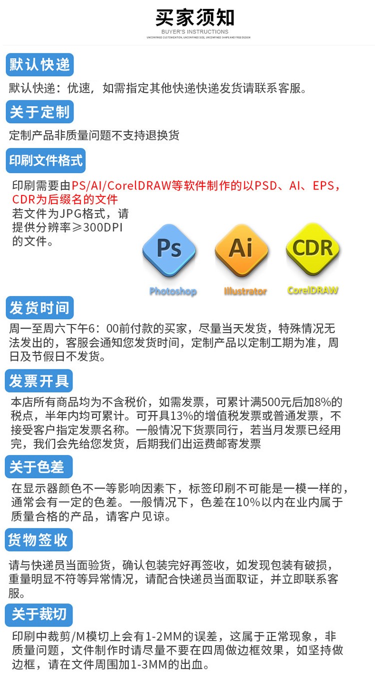 不干膠印刷,標(biāo)簽印刷,瓶貼印刷,不干膠(標(biāo)簽)印刷 產(chǎn)品名稱::?不干膠印刷,標(biāo)簽印刷,瓶貼印刷,不干膠(標(biāo)簽)印刷 常用尺寸::?按需要定制 常用材質(zhì)::?銅版紙不干膠,鋁箔紙不干膠,激光鐳射膜不干膠,易碎紙不干膠標(biāo)簽,PVC不干膠標(biāo)簽,PP(聚丙烯)不干膠標(biāo)簽,更多材質(zhì)請(qǐng)咨詢客服 加工工藝::?覆啞膜、覆光膜 出貨周期::?無(wú)需工藝3天,需覆膜4天,更多工藝請(qǐng)咨詢客服