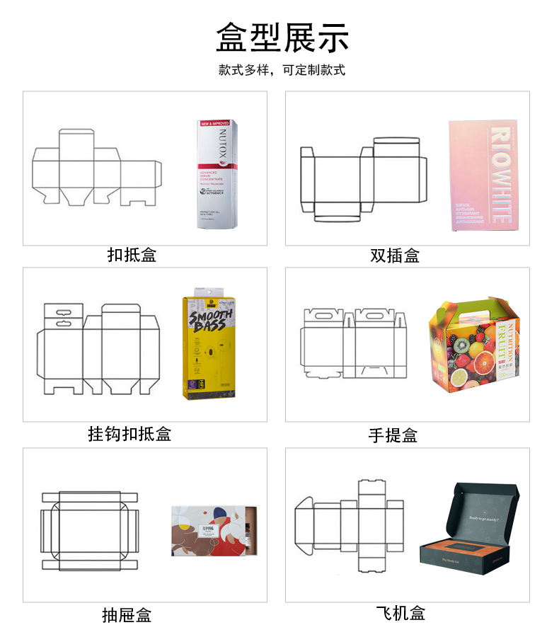 常用尺寸::?按需訂做 常用紙張::?單銅紙(白卡):250克、300克、350克; 牛皮紙(白牛/黃牛):250克、300克、350克; 白板紙(灰底白):250克、300克、350克; 特種紙(常用120克裱于灰板紙上,品種繁多) 瓦楞紙(裱于單銅或白板面紙上,一般應(yīng)用于產(chǎn)品外包裝盒) 常用工藝::?啤、粘、過光/啞膠、UV、擊突、燙金/銀