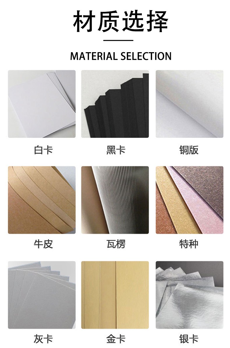 常用尺寸::?按需訂做 常用紙張::?單銅紙(白卡):250克、300克、350克、400克; 牛皮紙(白牛/黃牛):250克、300克、350克、400克; 白板紙(灰底白):250克、300克、350克、400克; 特種紙(常用120克裱于灰板紙上,品種繁多) 瓦楞紙(裱于單銅或白板面紙上,一般應(yīng)用于產(chǎn)品外包裝盒) 常用工藝::?啤、粘、過(guò)光/啞膠、UV、擊突、燙金/銀