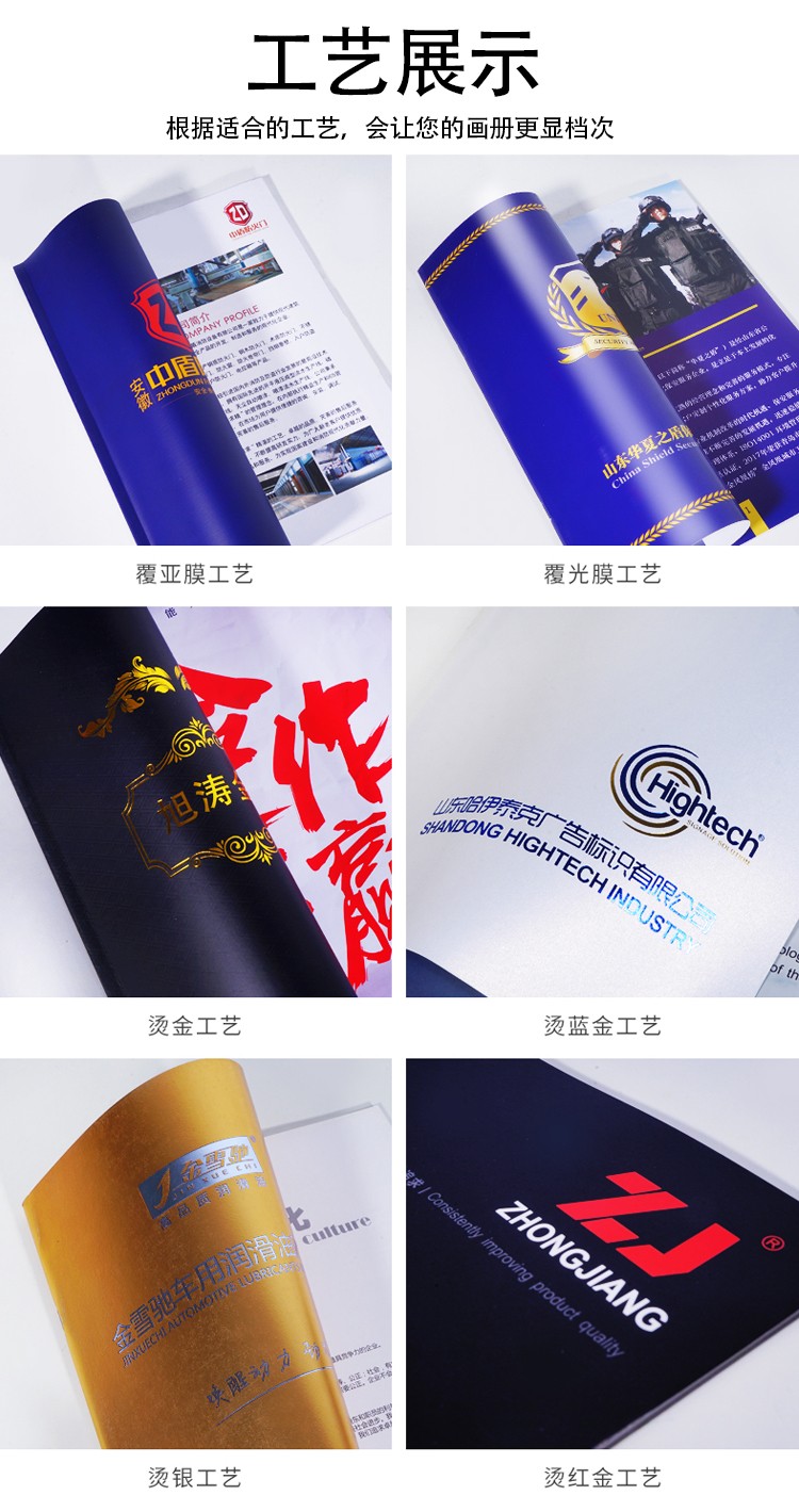 可選工藝:表面工藝可覆膜、過(guò)油、磨光、過(guò)膠、燙金/銀、壓紋、模切、UV、擊凸、開(kāi)窗貼PVC等膠片工藝。